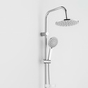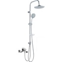 Устройство: душевая система • Смеситель: джойстик • Ручной душ (душевая лейка): размер 125 мм, настройки 5 шт • Верхний душ (тропический): размер 225 мм, настройки 1 шт • Комплектация: ручной душ, верхний душ, смеситель, стойка, шланг, крепление ручного душа, мыльница